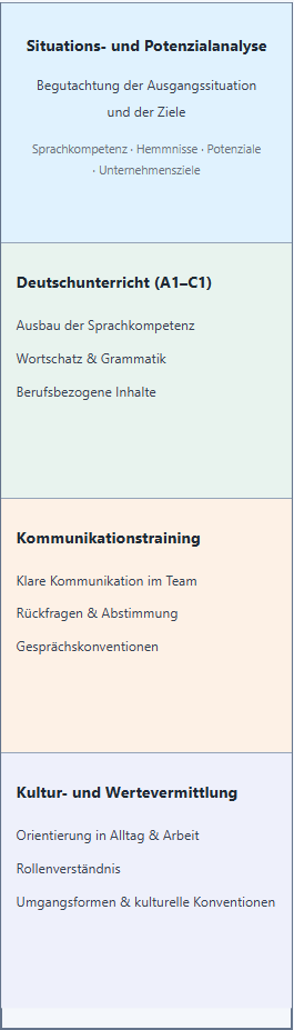 Darüber hinaus können Erwartungen und Rollen im Arbeitsumfeld thematisiert werden, etwa im Umgang mit Verantwortung, Zuständigkeiten oder Hierarchien. Auch gängige Umgangsformen und kulturelle Konventionen können Bestandteil der Vermittlung sein.